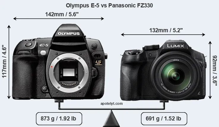 The above size and weight comparisons are to some extent incomplete and possibly misleading, as the FZ330 has a lens built in, whereas the E-5 is an interchangeable lens camera that requires a separate lens. Attaching the latter will add extra weight and bulk to the setup. You can compare the optics available for the E-5 and their specifications in the Four Thirds Lens Catalog.
