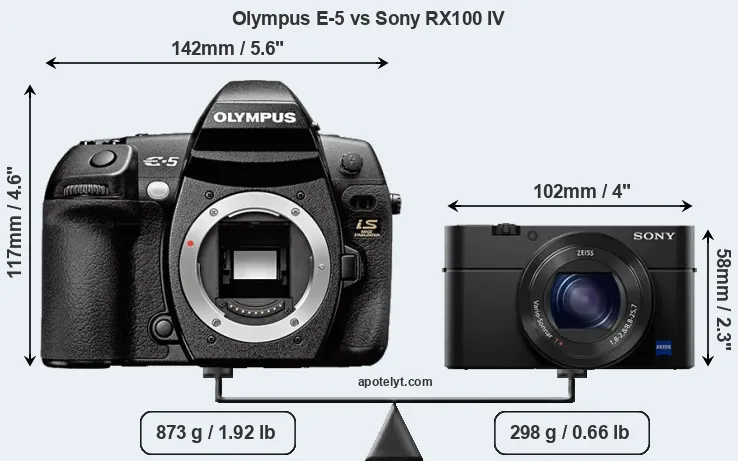 An illustration of the physical size and weight of the Olympus E-5 and the Sony RX100 IV is provided in the side-by-side display below. The two cameras are presented according to their relative size. Three consecutive views from the front, the top, and the rear side are shown. All width, height and depth dimensions are rounded to the nearest millimeter.