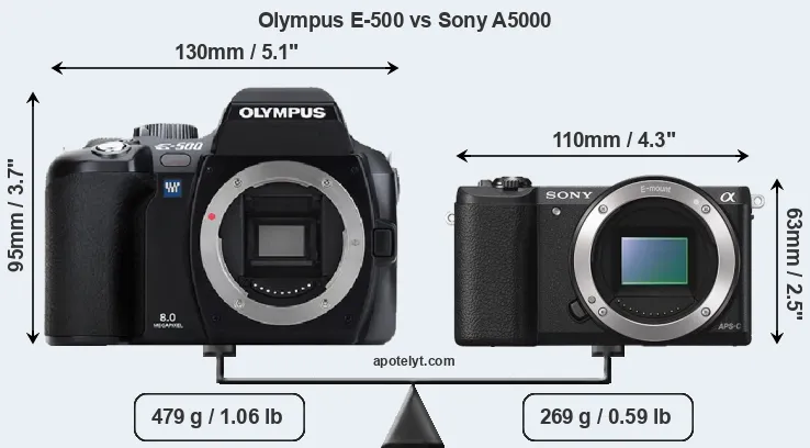 The side-by-side display below illustrates the physical size and weight of the Olympus E-500 and the Sony A5000. The two cameras are presented according to their relative size. Three successive views from the front, the top, and the rear are shown. All width, height and depth dimensions are rounded to the nearest millimeter.