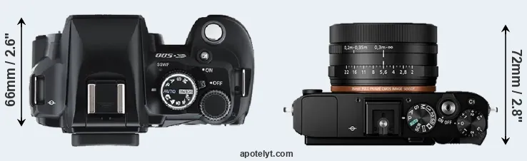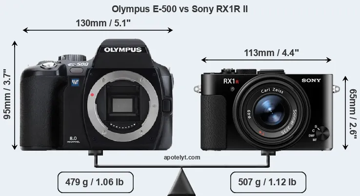 The above size and weight comparisons are to some extent incomplete and possibly misleading, as the RX1R II has a lens built in, whereas the E-500 is an interchangeable lens camera that requires a separate lens. Attaching the latter will add extra weight and bulk to the setup. You can compare the optics available for the E-500 and their specifications in the Four Thirds Lens Catalog.