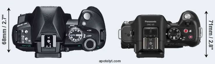 The above size and weight comparisons are to some extent incomplete since they do not consider the interchangeable lenses that both of these cameras require. Both cameras have similarly sized sensors, but DSLRs have a larger flange-to-focal plane distance than mirrorless cameras, which imposes contraints on the optical engineering process and generally leads to bigger and heavier lenses. You can compare the optics available for the two cameras in the Four Thirds Lens Catalog (E-510) and the Micro Four Thirds Lens Catalog (G5). Mirrorless cameras, such as the G5, have moreover the advantage that they can use many lenses from other systems via adapters, as they have a relatively short flange to focal plane distance.