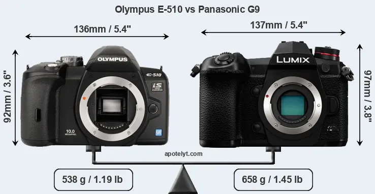 If the front view area (width x height) of the cameras is taken as an aggregate measure of their size, the Panasonic G9 is notably larger (6 percent) than the Olympus E-510. Moreover, the G9 is markedly heavier (22 percent) than the E-510. It is noteworthy in this context that the G9 is splash and dust-proof, while the E-510 does not feature any corresponding weather-sealing.