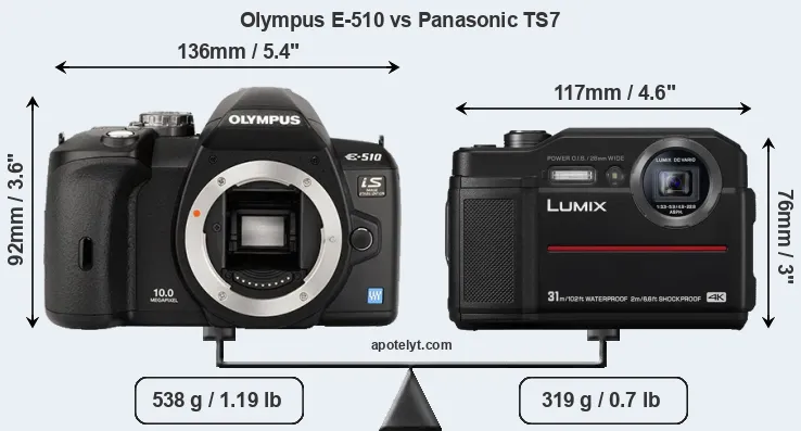 An illustration of the physical size and weight of the Olympus E-510 and the Panasonic TS7 is provided in the side-by-side display below. The two cameras are presented according to their relative size. Three consecutive views from the front, the top, and the rear side are shown. All width, height and depth measures are rounded to the nearest millimeter.