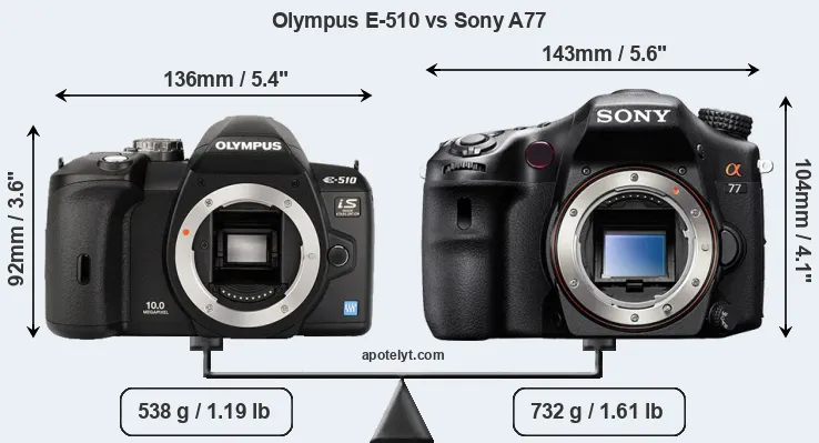 If the front view area (width x height) of the cameras is taken as an aggregate measure of their size, the Sony A77 is notably larger (19 percent) than the Olympus E-510. Moreover, the A77 is substantially heavier (36 percent) than the E-510. It is noteworthy in this context that the A77 is splash and dust-proof, while the E-510 does not feature any corresponding weather-sealing.
