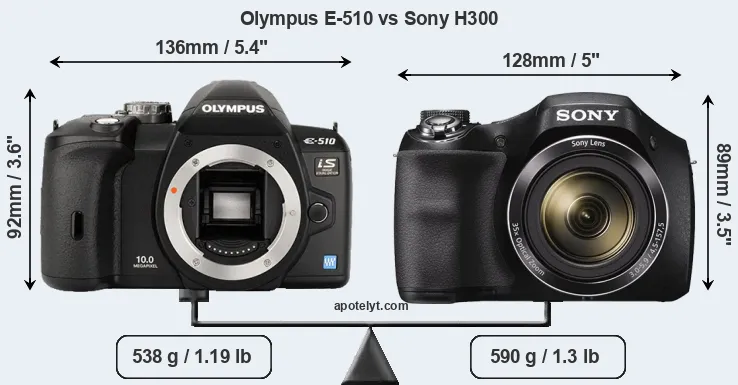 If the front view area (width x height) of the cameras is taken as an aggregate measure of their size, the Sony H300 is notably smaller (9 percent) than the Olympus E-510. In this context, it is worth noting that neither the E-510 nor the H300 are weather-sealed.