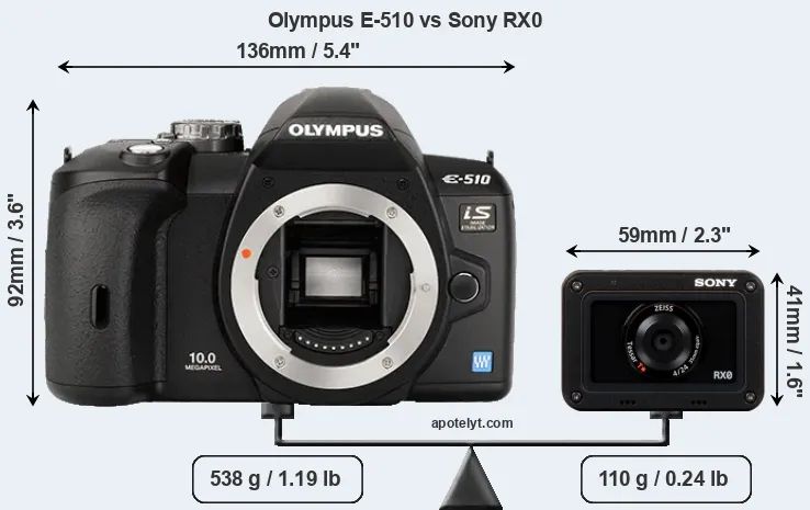 The above size and weight comparisons are to some extent incomplete and possibly misleading, as the RX0 has a lens built in, whereas the E-510 is an interchangeable lens camera that requires a separate lens. Attaching the latter will add extra weight and bulk to the setup. You can compare the optics available for the E-510 and their specifications in the Four Thirds Lens Catalog.
