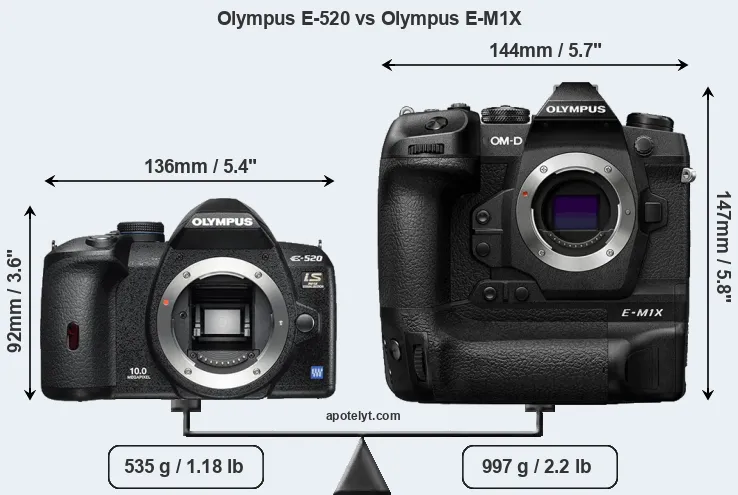 The physical size and weight of the Olympus E-520 and the Olympus E-M1X are illustrated in the side-by-side display below. The two cameras are presented according to their relative size. Three consecutive perspectives from the front, the top, and the back are available. All width, height and depth dimensions are rounded to the nearest millimeter.