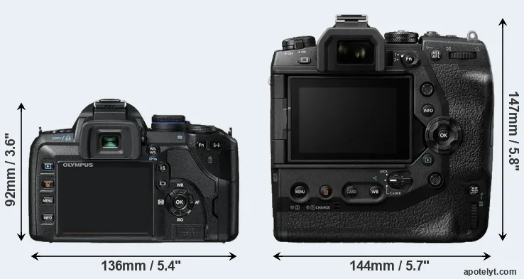 The above size and weight comparisons are to some extent incomplete since they do not consider the interchangeable lenses that both of these cameras require. Both cameras have similarly sized sensors, but DSLRs have a larger flange-to-focal plane distance than mirrorless cameras, which imposes contraints on the optical engineering process and generally leads to bigger and heavier lenses. You can compare the optics available for the two cameras in the Four Thirds Lens Catalog (E-520) and the Micro Four Thirds Lens Catalog (E-M1X). Mirrorless cameras, such as the E-M1X, have moreover the advantage that they can use many lenses from other systems via adapters, as they have a relatively short flange to focal plane distance.