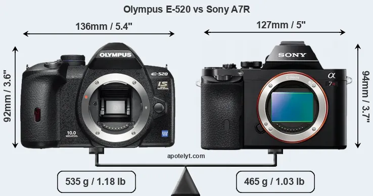 If the front view area (width x height) of the cameras is taken as an aggregate measure of their size, the Sony A7R is somewhat smaller (5 percent) than the Olympus E-520. Moreover, the A7R is markedly lighter (13 percent) than the E-520. It is noteworthy in this context that the A7R is splash and dust-proof, while the E-520 does not feature any corresponding weather-sealing.