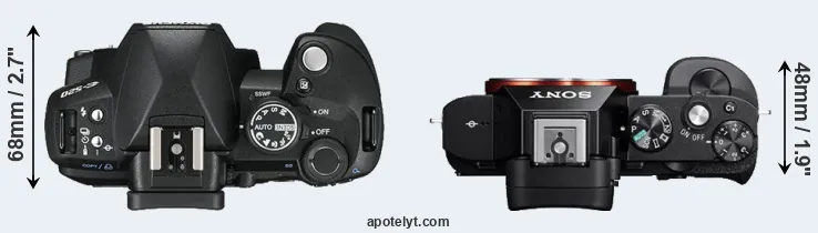 The side-by-side display below illustrates the physical size and weight of the Olympus E-520 and the Sony A7R. The two cameras are presented according to their relative size. Three successive views from the front, the top, and the rear are shown. All size dimensions are rounded to the nearest millimeter.