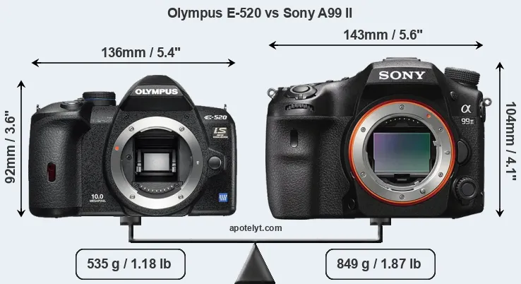 If the front view area (width x height) of the cameras is taken as an aggregate measure of their size, the Sony A99 II is notably larger (19 percent) than the Olympus E-520. Moreover, the A99 II is substantially heavier (59 percent) than the E-520. It is noteworthy in this context that the A99 II is splash and dust-proof, while the E-520 does not feature any corresponding weather-sealing.