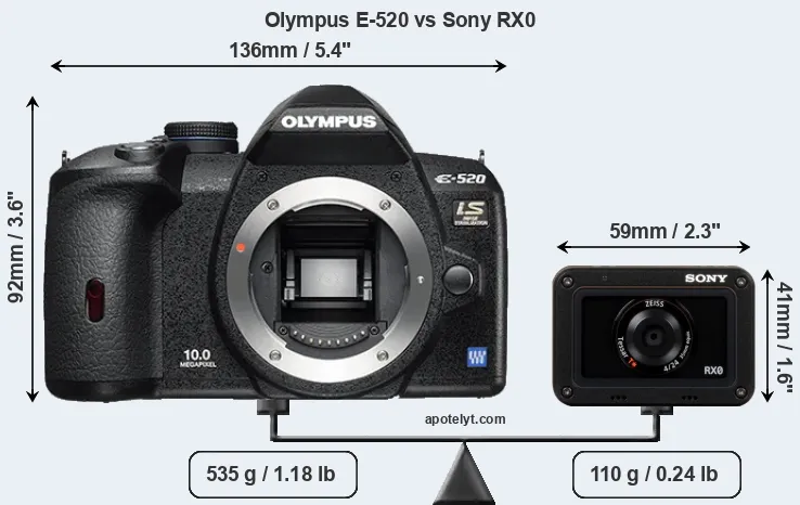 The physical size and weight of the Olympus E-520 and the Sony RX0 are illustrated in the side-by-side display below. The two cameras are presented according to their relative size. Three consecutive views from the front, the top, and the rear side are shown. All size dimensions are rounded to the nearest millimeter.