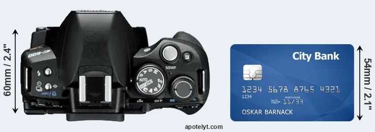 The physical dimensions of the Olympus E-600 relative to a credit card are illustrated in the side-by-side display below. Three consecutive perspectives from the front, the top, and the back are presented. All size dimensions are rounded to the nearest millimeter.
