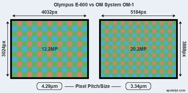 While the two cameras under review share the same sensor size, the OM-1 offers a higher resolution of 20.2 megapixels, compared with 12.2 MP of the E-600. This megapixels advantage translates into a 29 percent gain in linear resolution. On the other hand, these sensor specs imply that the OM-1 has a higher pixel density and a smaller size of the individual pixel (with a pixel pitch of 3.34μm versus 4.29μm for the E-600). However, it should be noted that the OM-1 is much more recent (by 12 years and 5 months) than the E-600, and its sensor will have benefitted from technological advances during this time that compensate for the smaller pixel size. Coming back to sensor resolution, it should be mentioned that the OM-1 has no anti-alias filter installed, so that it can capture all the detail its sensor resolves.