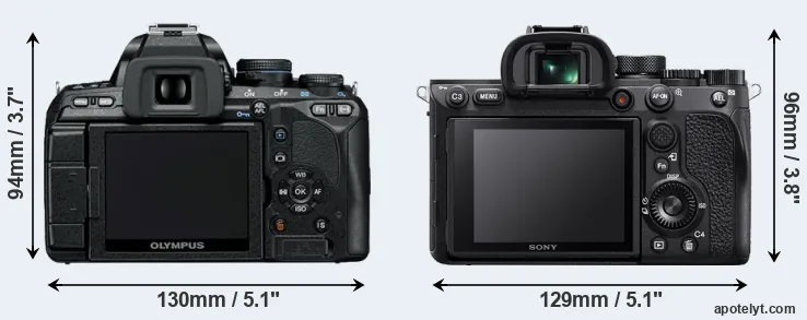 If the front view area (width x height) of the cameras is taken as an aggregate measure of their size, the Sony A7R IV is somewhat larger (1 percent) than the Olympus E-600. Moreover, the A7R IV is markedly heavier (24 percent) than the E-600. It is noteworthy in this context that the A7R IV is splash and dust-proof, while the E-600 does not feature any corresponding weather-sealing.