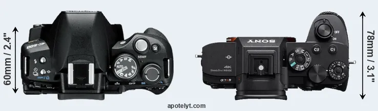 The physical size and weight of the Olympus E-600 and the Sony A7R IV are illustrated in the side-by-side display below. The two cameras are presented according to their relative size. Three consecutive views from the front, the top, and the rear side are shown. All size dimensions are rounded to the nearest millimeter.