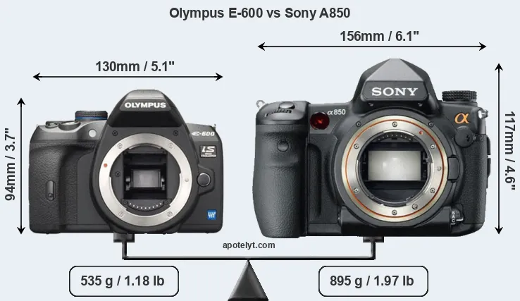 If the front view area (width x height) of the cameras is taken as an aggregate measure of their size, the Sony A850 is considerably larger (49 percent) than the Olympus E-600. Moreover, the A850 is substantially heavier (67 percent) than the E-600. It is noteworthy in this context that the A850 is splash and dust-proof, while the E-600 does not feature any corresponding weather-sealing.