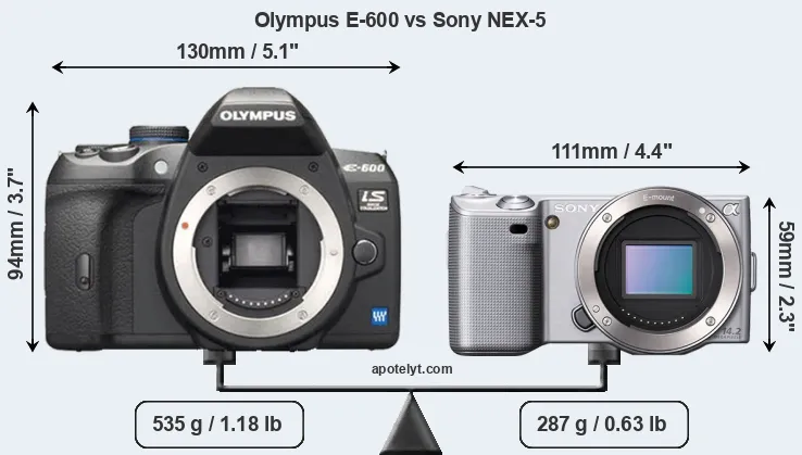 An illustration of the physical size and weight of the Olympus E-600 and the Sony NEX-5 is provided in the side-by-side display below. The two cameras are presented according to their relative size. Three consecutive views from the front, the top, and the rear side are shown. All width, height and depth measures are rounded to the nearest millimeter.