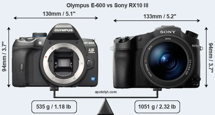 The side-by-side display below illustrates the physical size and weight of the Olympus E-600 and the Sony RX10 III. The two cameras are presented according to their relative size. Three consecutive perspectives from the front, the top, and the back are available. All width, height and depth measures are rounded to the nearest millimeter.
