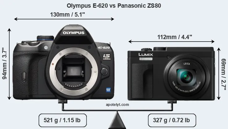 The physical size and weight of the Olympus E-620 and the Panasonic ZS80 are illustrated in the side-by-side display below. The two cameras are presented according to their relative size. Three consecutive perspectives from the front, the top, and the back are available. All width, height and depth dimensions are rounded to the nearest millimeter.