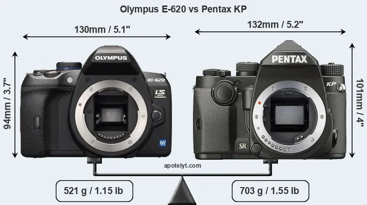 Going beyond this snapshot of core features and characteristics, what are the differences between the Olympus E-620 and the Pentax KP? Which one should you buy? Read on to find out how these two cameras compare with respect to their body size, their imaging sensors, their shooting features, their input-output connections, and their reception by expert reviewers.