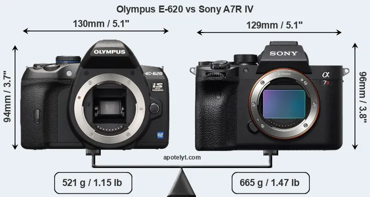 If the front view area (width x height) of the cameras is taken as an aggregate measure of their size, the Sony A7R IV is somewhat larger (1 percent) than the Olympus E-620. Moreover, the A7R IV is markedly heavier (28 percent) than the E-620. It is noteworthy in this context that the A7R IV is splash and dust-proof, while the E-620 does not feature any corresponding weather-sealing.