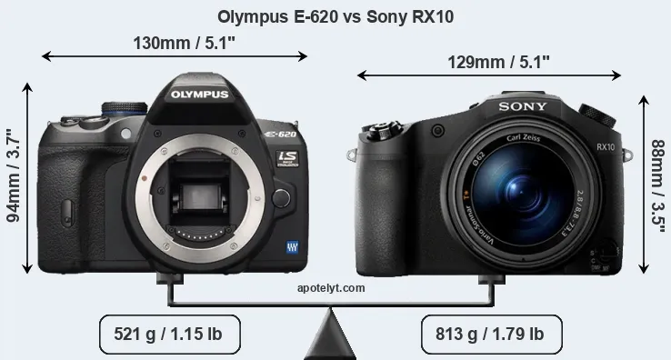If the front view area (width x height) of the cameras is taken as an aggregate measure of their size, the Sony RX10 is notably smaller (7 percent) than the Olympus E-620. It is noteworthy in this context that the RX10 is splash and dust-proof, while the E-620 does not feature any corresponding weather-sealing.