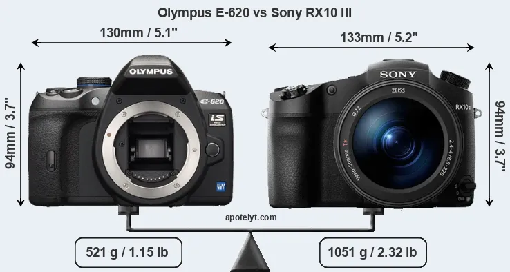 The above size and weight comparisons are to some extent incomplete and possibly misleading, as the RX10 III has a lens built in, whereas the E-620 is an interchangeable lens camera that requires a separate lens. Attaching the latter will add extra weight and bulk to the setup. You can compare the optics available for the E-620 and their specifications in the Four Thirds Lens Catalog.