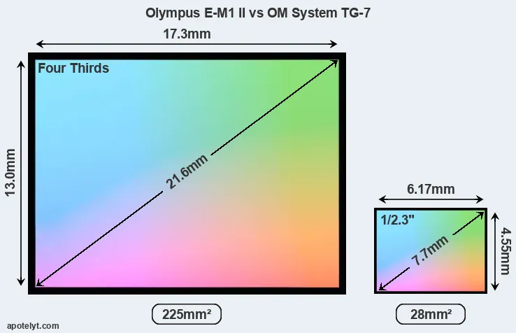 Of the two cameras under consideration, the Olympus E-M1 II features a Four Thirds sensor and the OM System TG-7 a 1/2.3-inch sensor. The sensor area in the TG-7 is 88 percent smaller. As a result of these sensor size differences, the cameras have a format factor of, respectively, 2.0 and 5.6. Both cameras feature a native aspect ratio (sensor width to sensor height) of 4:3.