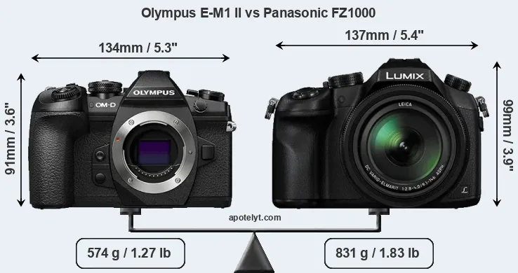 The physical size and weight of the Olympus E-M1 II and the Panasonic FZ1000 are illustrated in the side-by-side display below. The two cameras are presented according to their relative size. Three consecutive views from the front, the top, and the rear side are shown. All size dimensions are rounded to the nearest millimeter.