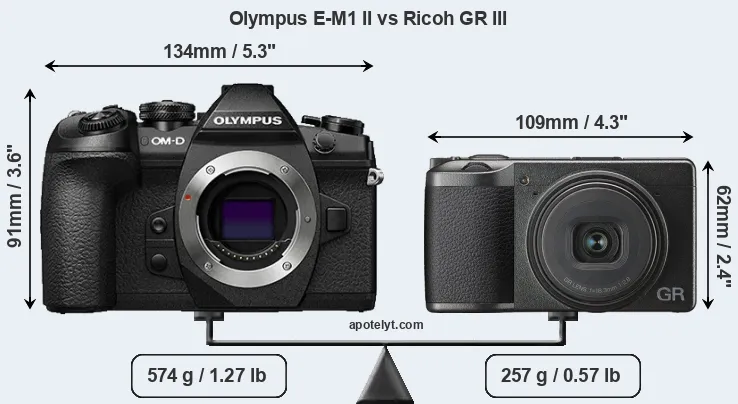 If the front view area (width x height) of the cameras is taken as an aggregate measure of their size, the Ricoh GR III is considerably smaller (45 percent) than the Olympus E-M1 II. It is worth mentioning in this context that the E-M1 II is splash and dust resistant, while the GR III does not feature any corresponding weather-sealing.