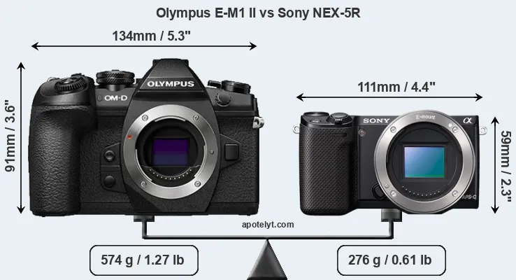 An illustration of the physical size and weight of the Olympus E-M1 II and the Sony NEX-5R is provided in the side-by-side display below. The two cameras are presented according to their relative size. Three consecutive perspectives from the front, the top, and the back are available. All size dimensions are rounded to the nearest millimeter.