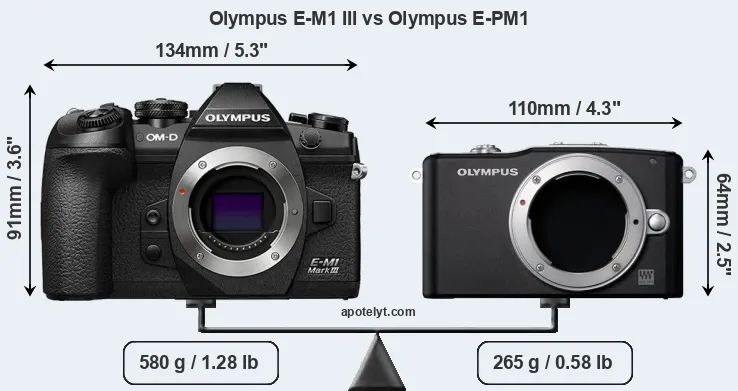 If the front view area (width x height) of the cameras is taken as an aggregate measure of their size, the Olympus E-PM1 is considerably smaller (42 percent) than the Olympus E-M1 III. Moreover, the E-PM1 is substantially lighter (54 percent) than the E-M1 III. It is worth mentioning in this context that the E-M1 III is splash and dust resistant, while the E-PM1 does not feature any corresponding weather-sealing.