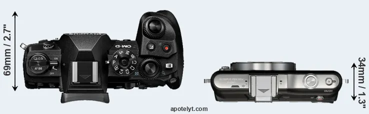 The physical size and weight of the Olympus E-M1 III and the Olympus E-PM1 are illustrated in the side-by-side display below. The two cameras are presented according to their relative size. Three consecutive perspectives from the front, the top, and the back are available. All width, height and depth dimensions are rounded to the nearest millimeter.