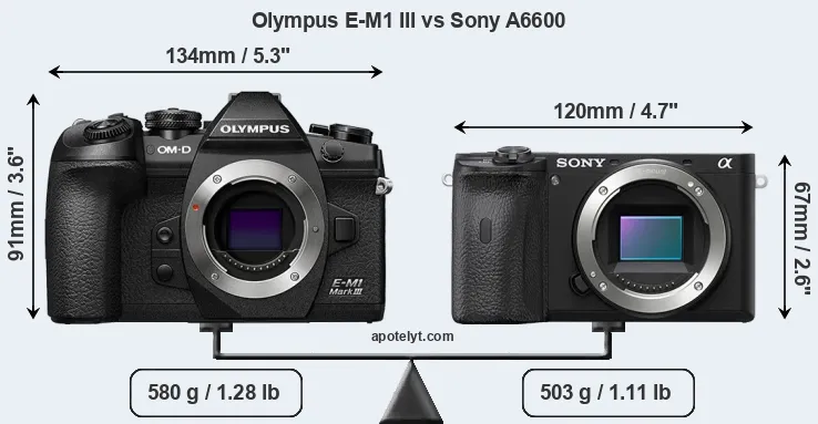 The physical size and weight of the Olympus E-M1 III and the Sony A6600 are illustrated in the side-by-side display below. The two cameras are presented according to their relative size. Three consecutive views from the front, the top, and the rear side are shown. All width, height and depth dimensions are rounded to the nearest millimeter.