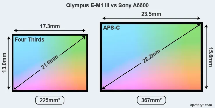 Of the two cameras under consideration, the Olympus E-M1 III features a Four Thirds sensor and the Sony A6600 an APS-C sensor. The sensor area in the A6600 is 63 percent bigger. As a result of these sensor size differences, the cameras have a format factor of, respectively, 2.0 and 1.5. The sensor in the E-M1 III has a native 4:3 aspect ratio, while the one in the A6600 offers a 3:2 aspect.