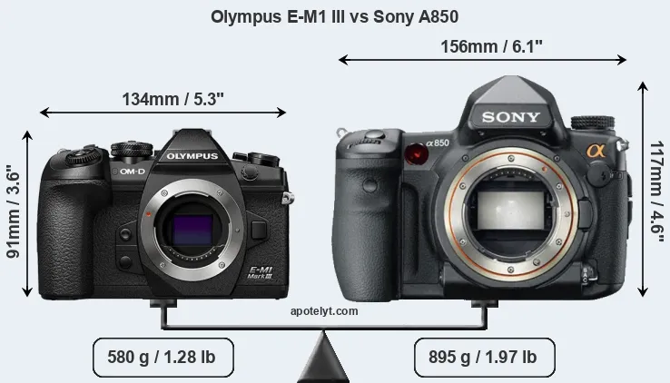 The side-by-side display below illustrates the physical size and weight of the Olympus E-M1 III and the Sony A850. The two cameras are presented according to their relative size. Three consecutive views from the front, the top, and the rear side are shown. All width, height and depth dimensions are rounded to the nearest millimeter.