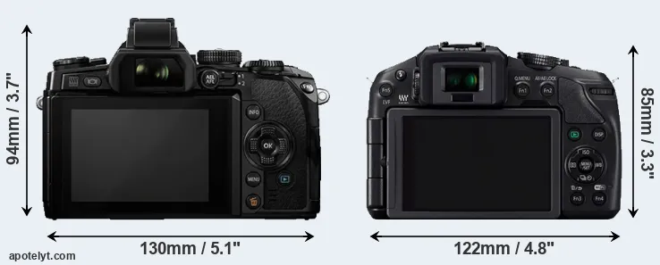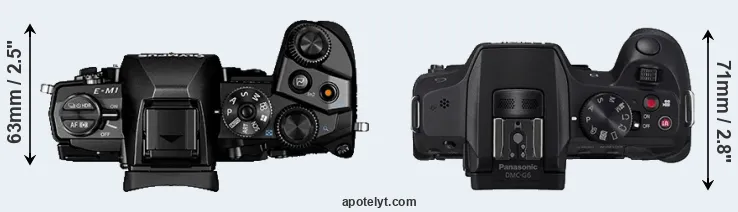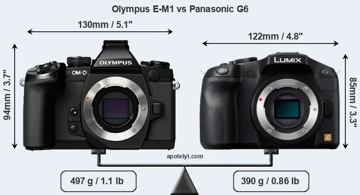 The side-by-side display below illustrates the physical size and weight of the Olympus E-M1 and the Panasonic G6. The two cameras are presented according to their relative size. Three consecutive perspectives from the front, the top, and the back are available. All width, height and depth dimensions are rounded to the nearest millimeter.