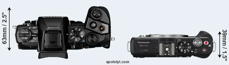 If the front view area (width x height) of the cameras is taken as an aggregate measure of their size, the Panasonic GX1 is considerably smaller (35 percent) than the Olympus E-M1. Moreover, the GX1 is substantially lighter (36 percent) than the E-M1. It is worth mentioning in this context that the E-M1 is splash and dust resistant, while the GX1 does not feature any corresponding weather-sealing.