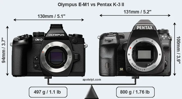 If the front view area (width x height) of the cameras is taken as an aggregate measure of their size, the Pentax K-3 II is notably larger (7 percent) than the Olympus E-M1. Moreover, the K-3 II is substantially heavier (61 percent) than the E-M1. In this context, it is worth noting that both cameras are splash and dust-proof and can, hence, be used in inclement weather conditions or harsh environments.