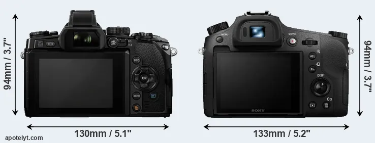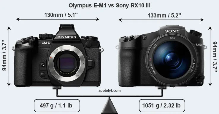 The side-by-side display below illustrates the physical size and weight of the Olympus E-M1 and the Sony RX10 III. The two cameras are presented according to their relative size. Three consecutive perspectives from the front, the top, and the back are available. All size dimensions are rounded to the nearest millimeter.
