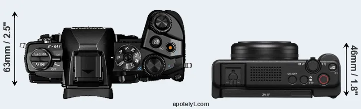 An illustration of the physical size and weight of the Olympus E-M1 and the Sony ZV-1F is provided in the side-by-side display below. The two cameras are presented according to their relative size. Three successive views from the front, the top, and the rear are shown. All width, height and depth measures are rounded to the nearest millimeter.
