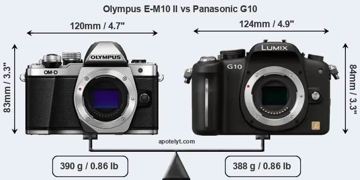 If the front view area (width x height) of the cameras is taken as an aggregate measure of their size, the Panasonic G10 is somewhat larger (5 percent) than the Olympus E-M10 II. However, the G10 is slightly lighter (1 percent) than the E-M10 II. In this context, it is worth noting that neither the E-M10 II nor the G10 are weather-sealed.
