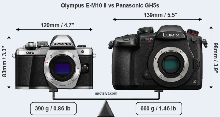 If the front view area (width x height) of the cameras is taken as an aggregate measure of their size, the Panasonic GH5s is notably larger (37 percent) than the Olympus E-M10 II. Moreover, the GH5s is substantially heavier (69 percent) than the E-M10 II. It is noteworthy in this context that the GH5s is splash and dust-proof, while the E-M10 II does not feature any corresponding weather-sealing.