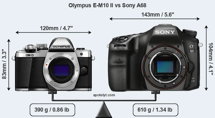 If the front view area (width x height) of the cameras is taken as an aggregate measure of their size, the Sony A68 is considerably larger (49 percent) than the Olympus E-M10 II. Moreover, the A68 is substantially heavier (56 percent) than the E-M10 II. In this context, it is worth noting that neither the E-M10 II nor the A68 are weather-sealed.