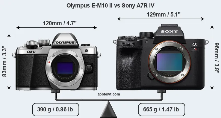 If the front view area (width x height) of the cameras is taken as an aggregate measure of their size, the Sony A7R IV is notably larger (24 percent) than the Olympus E-M10 II. Moreover, the A7R IV is substantially heavier (71 percent) than the E-M10 II. It is noteworthy in this context that the A7R IV is splash and dust-proof, while the E-M10 II does not feature any corresponding weather-sealing.