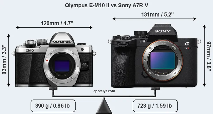 If the front view area (width x height) of the cameras is taken as an aggregate measure of their size, the Sony A7R V is notably larger (28 percent) than the Olympus E-M10 II. Moreover, the A7R V is substantially heavier (85 percent) than the E-M10 II. It is noteworthy in this context that the A7R V is splash and dust-proof, while the E-M10 II does not feature any corresponding weather-sealing.