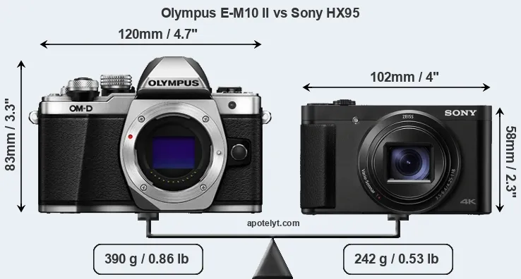 If the front view area (width x height) of the cameras is taken as an aggregate measure of their size, the Sony HX95 is considerably smaller (41 percent) than the Olympus E-M10 II. In this context, it is worth noting that neither the E-M10 II nor the HX95 are weather-sealed.