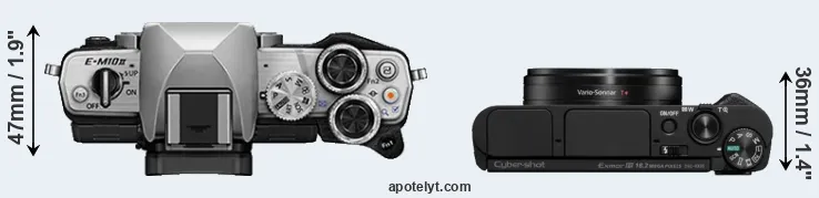 The side-by-side display below illustrates the physical size and weight of the Olympus E-M10 II and the Sony HX95. The two cameras are presented according to their relative size. Three consecutive views from the front, the top, and the rear side are shown. All size dimensions are rounded to the nearest millimeter.
