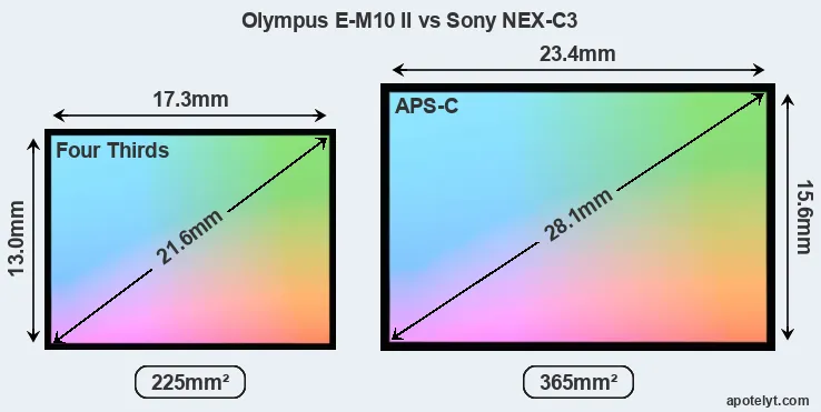 Of the two cameras under consideration, the Olympus E-M10 II features a Four Thirds sensor and the Sony NEX-C3 an APS-C sensor. The sensor area in the NEX-C3 is 62 percent bigger. As a result of these sensor size differences, the cameras have a format factor of, respectively, 2.0 and 1.5. The sensor in the E-M10 II has a native 4:3 aspect ratio, while the one in the NEX-C3 offers a 3:2 aspect.